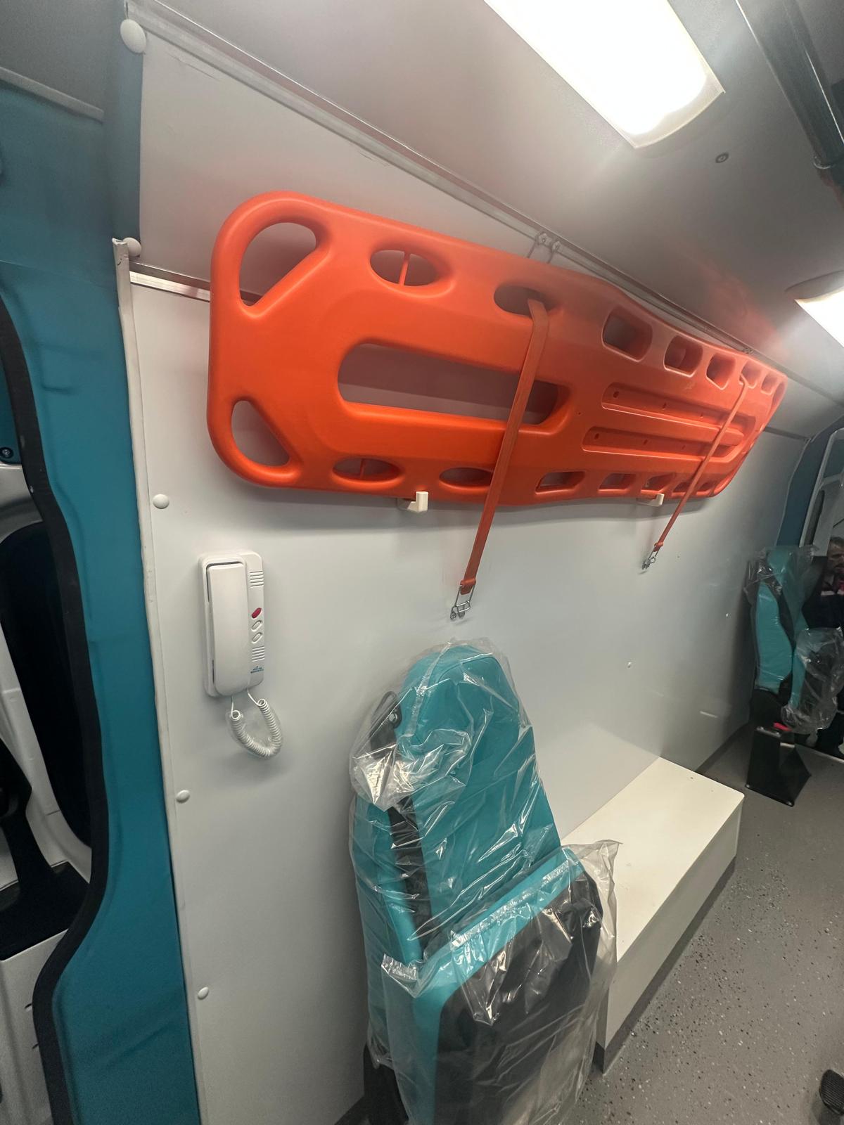 This ambulance is built in compliance with TS EN 1789 +A1 standards for road ambulances. It features water insulation, antibacterial flooring, a full LED lighting system for scene safety, and essential safety tools including fire extinguishers and glass-breaking hammers (ICU).