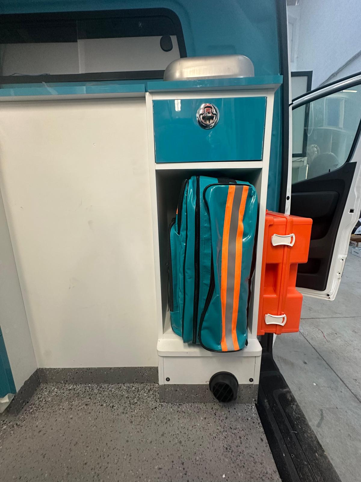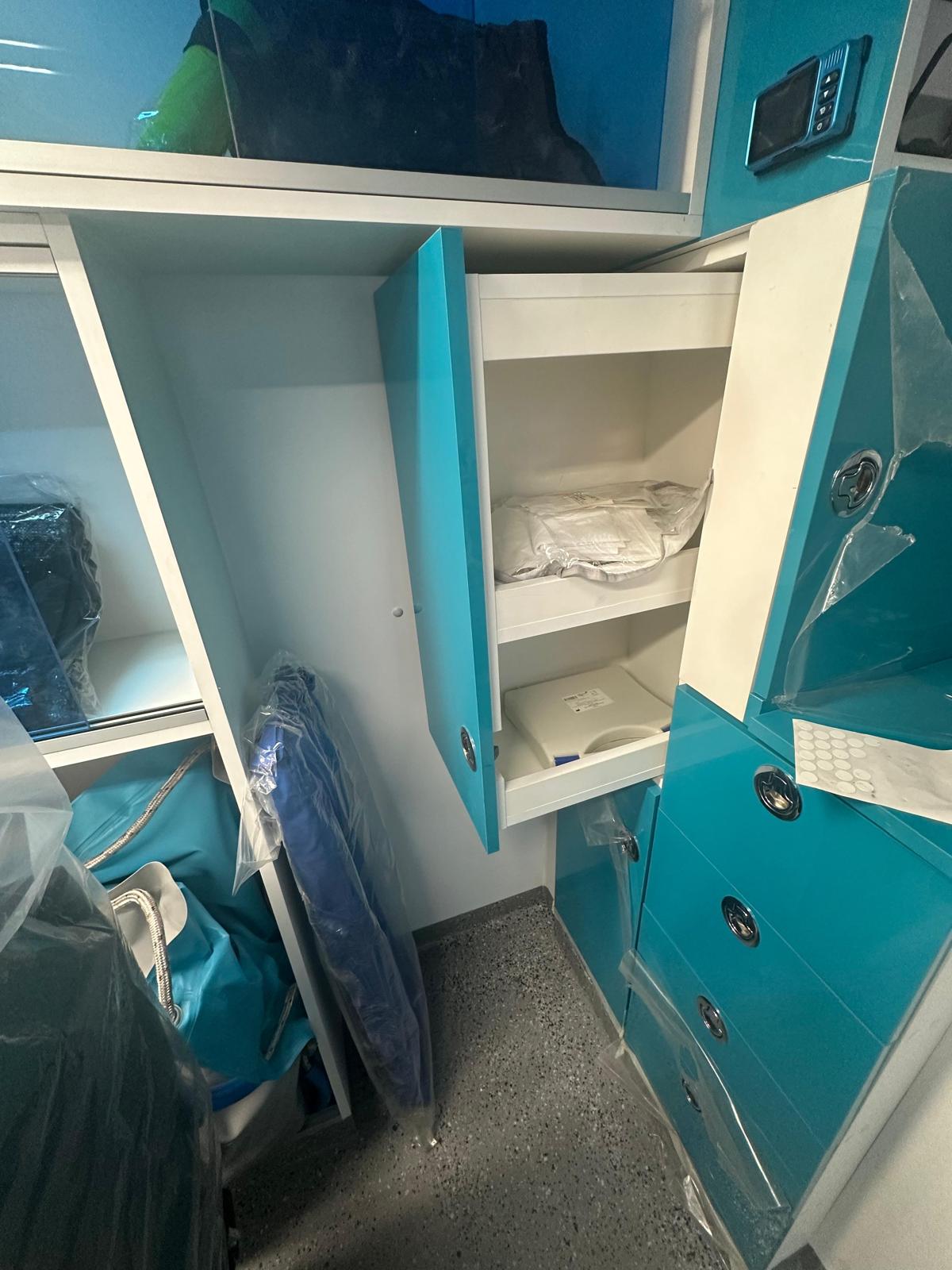 Absolutely. The Mercedes ambulance interior is specifically designed for critical care. It features ICU-branded cabinetry for organized storage of medications and disposables, a movable stretcher platform (ICU AASP-1) for optimal patient access, antibacterial epoxy flooring for hygiene, and multiple IV hangers and electrical sockets for medical devices.